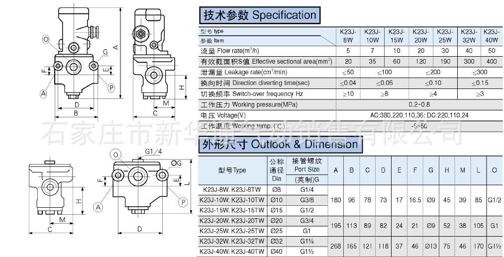 K23JD-25W电磁阀是一个二位三通管道连接常闭型电磁阀,直径为25mm。连接螺纹为g1。大口径大流量。工作压力为0.2〜0.8mpa。阀体上有三个端口,即p(进气口)a(工作端口)o(排气端口)。当线圈未通电时,p和a未连接,而a和o已连接。;线圈通电后,p和a相接。交流电压:38022011036.DC:22011024